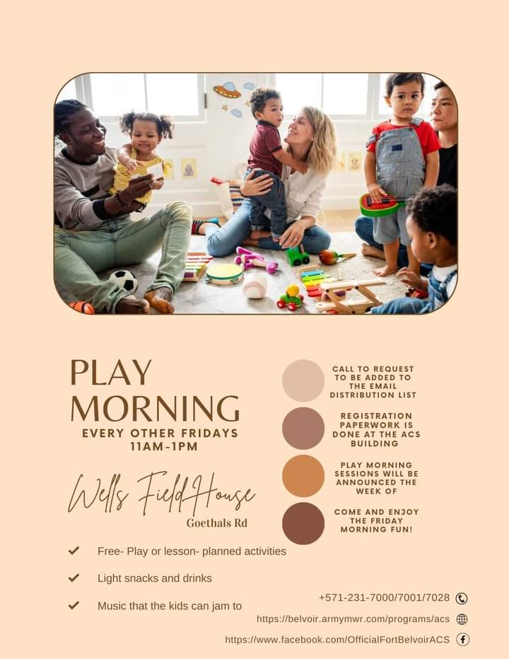 Starting Friday, June 2nd, ACS (Army Community Services) will be providing weekly playdates for the Fort Belvoir community as well as for all interested military families. More info to come.